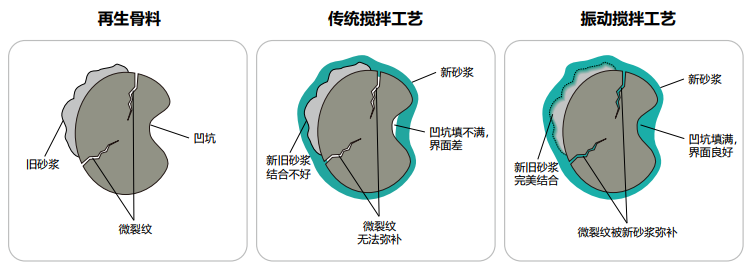 振動(dòng)攪拌技術(shù)用于建筑固廢再生,可通過強(qiáng)化微觀均勻性,彌補(bǔ)再生骨料微觀缺陷,明顯提升再生料(或再生制品) 質(zhì)量,并對(duì)不同種類的固廢再生具有良好適應(yīng)性。