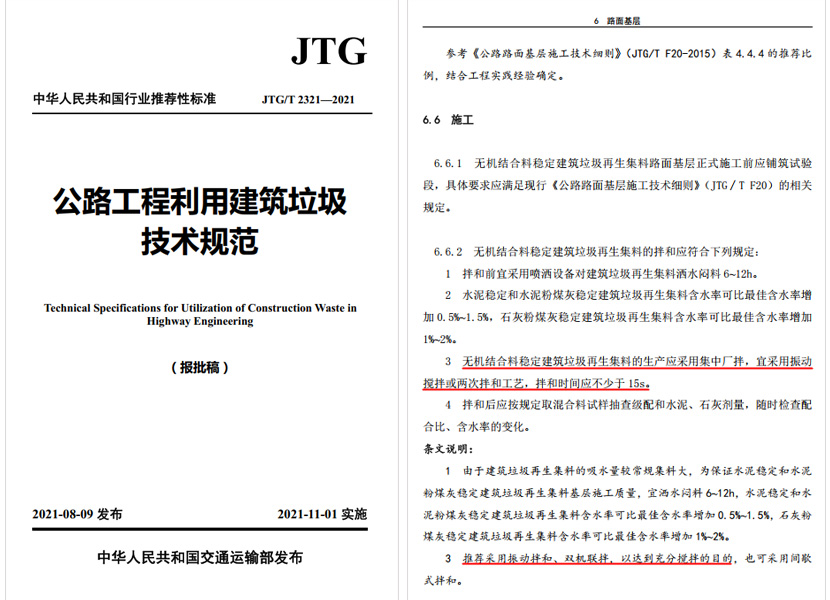 交通運(yùn)輸部發(fā)布實(shí)施的《公路工程利用建筑垃圾技術(shù)規(guī)范》,在對(duì)建筑垃圾再生集料拌和工藝要求條款中,推薦采用振動(dòng)攪拌工藝,以達(dá)到充分?jǐn)嚢璧哪康摹?/strong>