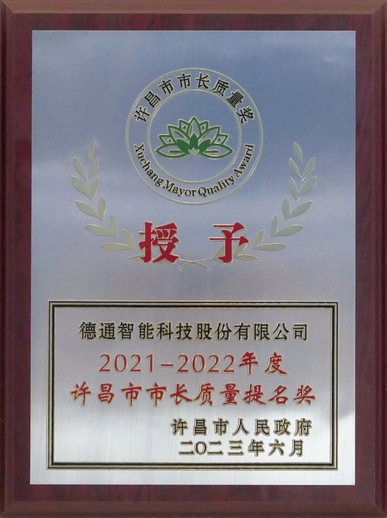 近日,許昌市人民政府發(fā)布《關(guān)于獎(jiǎng)勵(lì)2021-2022年度許昌市市長質(zhì)量獎(jiǎng)獲獎(jiǎng)單位的通報(bào)》,德通智能科技股份有限公司被授予“2021-2022年度許昌市市長質(zhì)量提名獎(jiǎng)”,獎(jiǎng)勵(lì)20萬元。