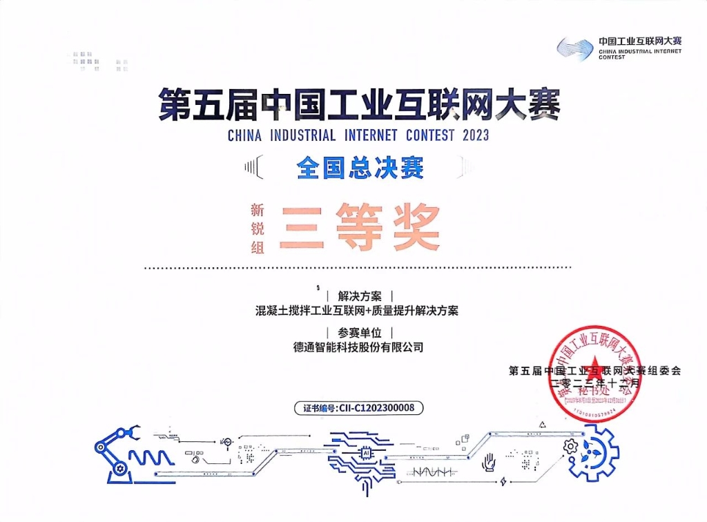 12月22日,由國家工業(yè)和信息化部主辦的第五屆中國工業(yè)互聯(lián)網(wǎng)大賽在浙江寧波圓滿閉幕,德通智能科技股份有限公司的參賽項(xiàng)目《混凝土攪拌工業(yè)互聯(lián)網(wǎng)+質(zhì)量提升解決方案》一路過關(guān)斬將闖進(jìn)總決賽,最終以第8名的成績奪得新銳組三等獎(jiǎng)。